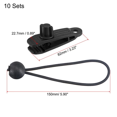 What is this?The ball elastic cords with tarp clamps kit have various applications for indoor or outdoor usages, fit for camping tent, canvases, cargo, hiking, boating, hauling, bundles, kayaks, awnings, banners, gardening, tarps, canes, canopies, tying storage, swimming pool covers and so on.What will I get?Color: BlackMaterial: Plastic, NylonRope Length: 150mm/ 5.90 inchClip Size: 82 x 22.7mm / 3.23 x 0.89 inch (L*W)Package Content: 10 x Rope, 10 x ClipAre there any advantages of this product?Made of nylon material, it can bear a large pulling force and is not easy to loose after buckling onto the objects. There are stable, windproof, wear-resistant, and long-term in use. How to use it?It’s easy to install, you need to grip the edge of the tarp, push on and screw down the jaws to grip, then to secure simply tightening or loosening the screw knobs. Pass the elastic cord through the hole of the clip and tighten up.What should I notice?Do not stretch the rope excessively and be careful that the rope rebound.