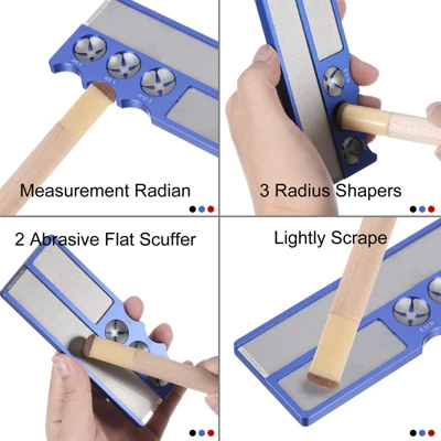billiard cue repair tool with 4 functions: Rough abrasive flat scuffer, Fine abrasive flat scuffer, Radius shaper and Measurement tools. Used to polish and repair your pool cue to help better hold the chalk, improving your hit rate and the ball probability of bagging. A useful tool for billiard lovers.Advantage:1. The billiard cue tip tool is made of aluminum alloy, which is sturdy, rust-proof and durable.2. The pool cue tip tool adopts a 4-in-1 functional design with rough/fine flat scuffer, radius shaper and measurement, which is practical, compact and portable.Instruction:1. Flat Scuffer: Two scuffer with different coarse and fine abrasives can better help you polish the cue tip to maximize chalk retention.2. Radius Shaper: Repair the radian of the cue head, this radian matches the radian of the cue head, it is a good tool to repair cue head, increase the contact area between the cue and ball, and prevent the cue from slipping.3. Arc Measurement Tool: There are measuring radian of different sizes to help you better repair and polish the cue head and contrast radian.NOTE: Please confirm the size of the arc before placing an order.