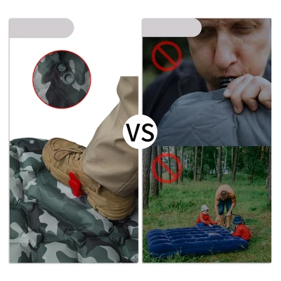 Wide application: The inflated size is 74.80″x23.62″x1.97″, you can use this camping mat for many purposes, such as for camping, hiking, and backpacking, good for sports competitions and flower viewing, home gardens, courtyard barbecues, and other parties.Material: This camping mat is made of good quality 40D nylon TPU material. The product is strong, soft, and comfortable, and it is noiseless to use. It is waterproof. Even if it gets wet on rainy days, you only need to wipe it with a towel.Comfortable: The camping pad also comes with a pillow, which can provide extra support for your neck and head. You don’t need to bring a pillow when you go camping, use the sleeping pad.Easy to Inflate and Deflate: This camping sleeping pad only takes 30 to 60 seconds to inflate. Unlike other traditional inflating methods, it has built-in foot pads. You only need to step on the air pump with your feet to complete the inflation. It is quickly deflated and is convenient for packaging and storage. Women, children, and the elderly can easily complete it.