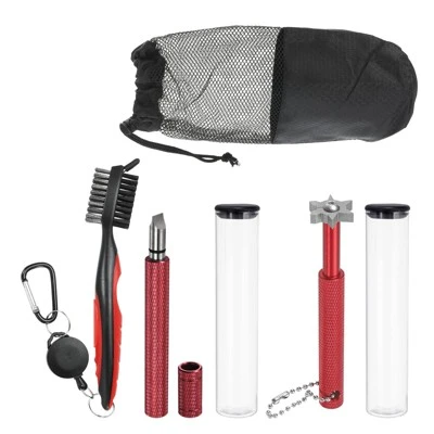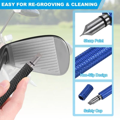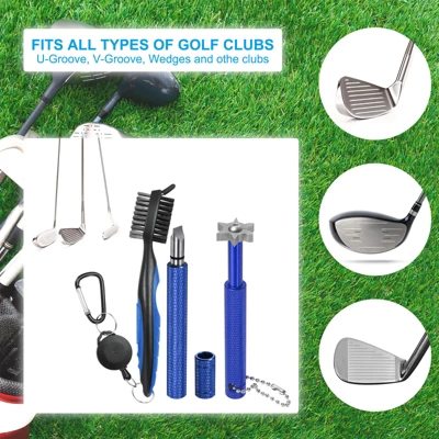 This golf clean tool set includes 2 golf club groove sharpeners and a golf brush, ideal for maintaining and restoring the U-grooves or V-grooves on golf clubs, particularly irons and wedges. The Golf Club Cleaning Brush features a double-sided head design with brass wire bristles for metal surfaces and nylon bristles for wood surfaces. The retractable lanyard extends up to 2 ft, making it easy to attach to a golf club bag. The portable club sharpener, made of stainless steel, is corrosion-resistant, rust-proof, and maintains its sharpness over time. The 6 Heads Golf Club Groove Sharpener Tool, made of alloy steel, offers high hardness, good wear resistance, and high-temperature resistance, ensuring effective sharpening of the grooves on the golf club. The set has a hanging chain and a storage bag for easy carrying. Use the sharpening tool carefully to avoid accidental cuts or damage, and keep it out of the reach of children and pets.