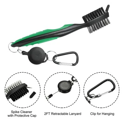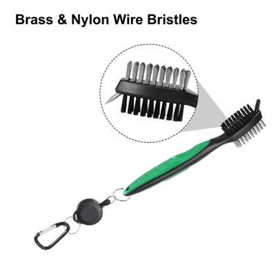 The golf brush is a popular accessory for golf bags, serving as a convenient tool to effectively clean the grooves on golf clubs, balls, and shoes. It is an essential cleaning tool that all golf players require to fully enjoy their game. The brass wire bristles are used for cleaning metal surfaces, while the nylon bristles are used for cleaning wood surfaces. Easy to carry, the brush has a plastic clip for attaching to the golf bag. The Retractable Lanyard is capable of being extended and conveniently attached to a golf club bag. This ensures easy access to this cleaning tool anytime during your golfing session. Notice: Please pay attention to the tip and hard bristles, and do not scratch your hands.