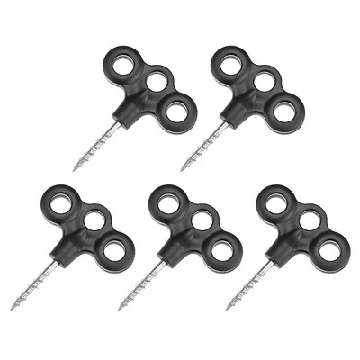 What is this?The tent stake is designed with a plastic top with 3 holes, which is convenient for hanging the windproof rope. The metal screw rod and pointed bottom make the stake easier to nail into the ground and grip more tightly. Widely used in camping deck, outdoor wooden floor and other places to fix the windproof rope of your camping tent, canopy, awnings, rain tarps, fabric net, etc.What will I get?Material: Plastic, IronOverall Size: 67mmx53mm / 2.6″x2.1″(L*W)Screw Rod Length: 32mm / 1.3″Hole Diameter: 9.5mm / 0.4″Package Content: 5 x Tent StakesAre there any advantages of the product?These ground pegs are waterproof, windproof, lightweight, durable and easy to carry.How to use it?1. Find the right spot and screw it in manually until can not move it;2. Hang the windproof rope on the hole;3. If you want to take out the stake, rotate the handle counterclockwise and pull it out.What should I notice?Please be careful with your hands when using these ground pegs.