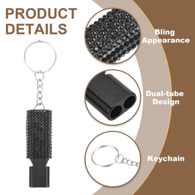 The whistle is a lightweight survival tool. It is suitable for various outdoor activities such as camping, hiking, backpacking, hunting, boating, fishing, and more. The survival whistle is made of sturdy alloy with a keyring, lightweight, and portable. The dual-tube design makes the safety whistle sound louder and clearer. The bling appearance improves the visibility of the whistle. The bling whistle can be hung on keys, bags, backpacks, or life vests, preventing loss. To prevent clogging, rinse with clean water and wipe dry with a cloth.