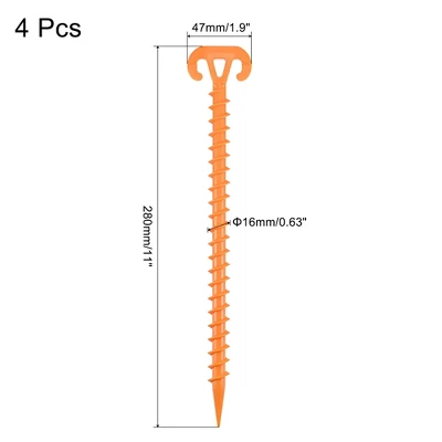What is this?The tent stake is designed with a handle of double hooks shaped, which is convenient for grasping. The pointed bottom and spiral rod make the stake easier to nail into the ground and grip more tightly. Widely used in various places, such as beach, sand, lawn, soil and so on to fix your camping tent, picnic mat, rain tarps, canopy, fabric net, outdoor inflatable sofa, etc.What will I get?Material: PlasticType: SpiralOverall Size: 28cmx4.7cm / 11″x1.9″(L*W)Screw Diameter: 16mm / 0.63″Package Content: 8 x Tent StakesAre there any advantages of the product?These plastic ground pegs are waterproof, windproof, corrosion-resistant, lightweight, easy to carry, durable and not easy to be bend. The pegs of bright color are easy to be found on the ground.How to use it?Hold the handle of the tent stake and turn it clockwise, nail the stake into the ground, then hang the windproof rope on the handle. If you want to take out the stake, you can rotate the handle counterclockwise and pull it out.What should I notice?Please be careful with your hands when using these ground pegs.