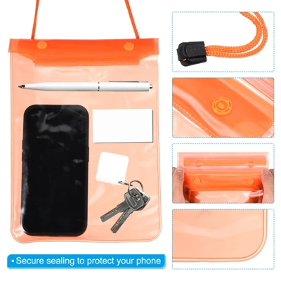 This transparent PVC bag features a smooth surface that allows direct contact with the screen, allowing you to send and check messages without removing your phone. It features a thick, waterproof seal and comes with a durable lanyard for easy portability. A must-have universal waterproof phone bag for vacations, the transparent bag can hold most mobile phones and is suitable for swimming pools, beaches, surfing, fishing, swimming, sailing, kayaking, snorkeling, rafting, and other outdoor water activities. Instructions: Open the bag’s seal, insert your phone, and seal the opening. Note: Before each use, test the bag’s waterproofness with a tissue.