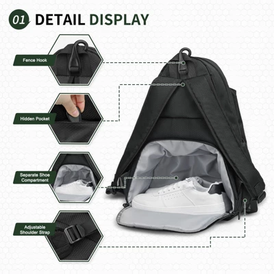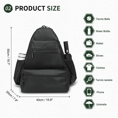 Padded compartment fits up to two tennis rackets or pickleball paddles, secured with straps to prevent shifting. Organize your gear easily for matches, practice, or casual play. The rear shoe compartment keeps dirty shoes isolated from other items. Holds up to US men’s sneakers, keeping your tennis or pickleball gear cleaner and more organized. Lower front pocket features waterproof lining, optimal for holding up to tennis balls, cold drinks, or wet towels. Keeps moisture contained and protects dry items in other compartments. Spacious main compartment includes a wet/dry pouch for clothes or towels. Two side mesh pockets hold ball cans or water bottles. The foldable top hook allows easy hanging on court fences or doors. Crafted from high-density Oxford fabric with a stylish honeycomb texture. Water-resistant, easy to clean, and built to withstand daily use. Great for tennis, pickleball, badminton, gym, or travel.